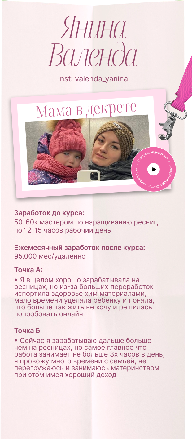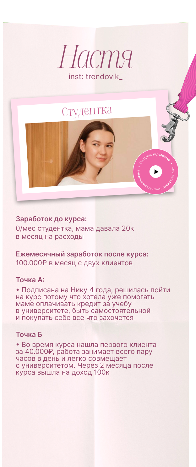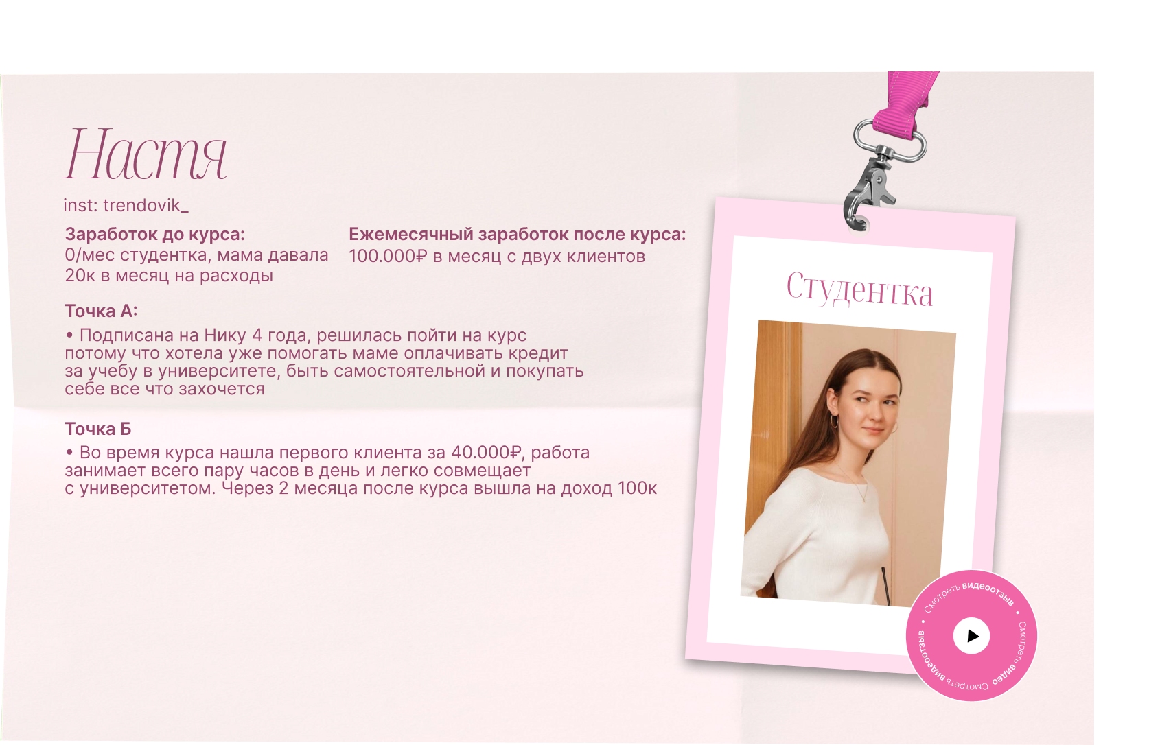 Максимальное сопровождение и личная работа с Никой над твоим результатом.